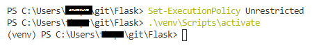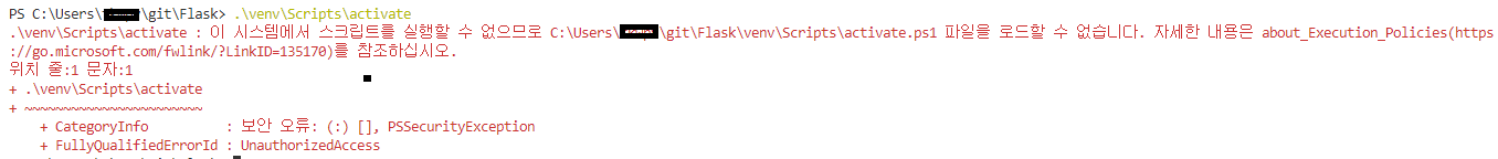 .\venv\Scripts\activate : 이 시스템에서 스크립트를 실행할 수 없으므로 C:\Users\tkwpv\git\Flask\venv\Scripts\activate.ps1 파일을 로드할 수 없습니다.