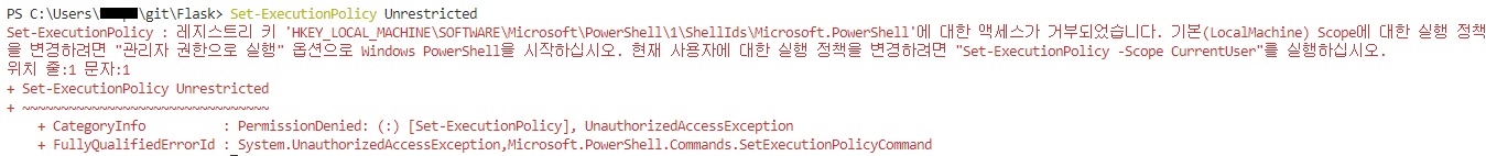 Set-ExecutionPolicy : 레지스트리 키 'HKEY_LOCAL_MACHINE\SOFTWARE\Microsoft\PowerShell\1\ShellIds\Microsoft.PowerShell'에 대한 액세스가 거부되었습니다. 기본(LocalMachine) Scope에 대한 실행 정책